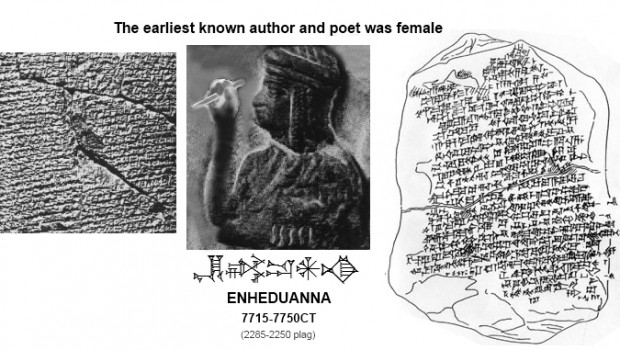 La importancia del disco no radica solo en ser una prueba histórica de la existencia de Enheduanna, sino que también ofrece un retrato suyo tallado, realizando un ritual para su amada Inanna. Tras este hallazgo, las excavaciones arqueológicas continuaron y se encontraron tablillas de arcilla con 48 poemas dela Suma Sacerdotisa, alcanzando 4.200 líneas, todos ellos firmados por ella misma, con lo que fue la primera autora de la historia. Empezó a escribir apenas 350 años después de que la escritura estuviera constituida por completo.